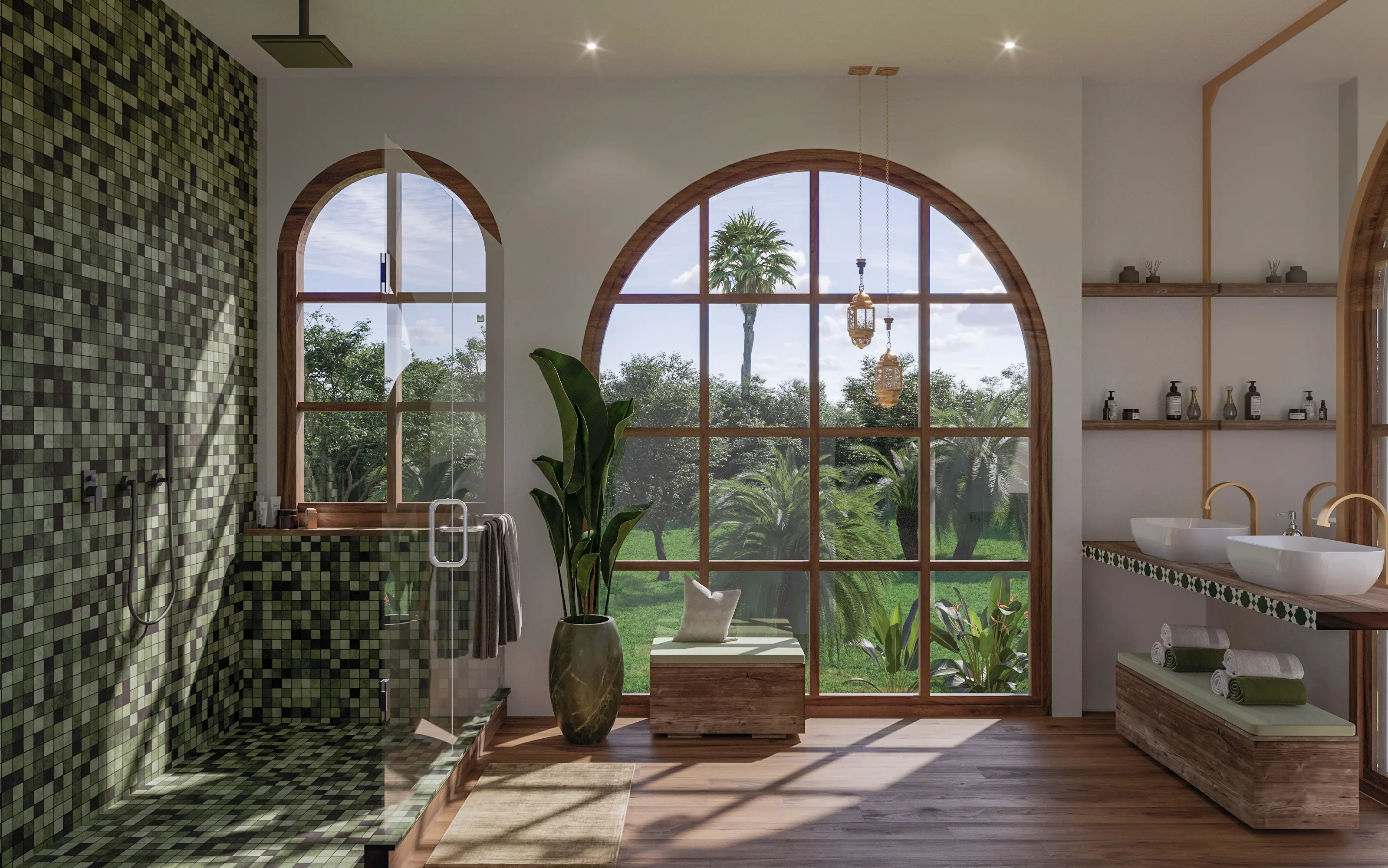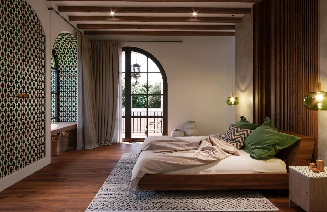 Daylight is introduced with intention, filtered through courtyards, openings and shaded thresholds rather than broad exposure. Mornings arrive softly as light washes across plastered surfaces and tile floors. As the day progresses, light recedes gradually into shadow. Treated as a spatial element rather than a spectacle, light reveals texture and material character while supporting natural circadian rhythms and visual calm.