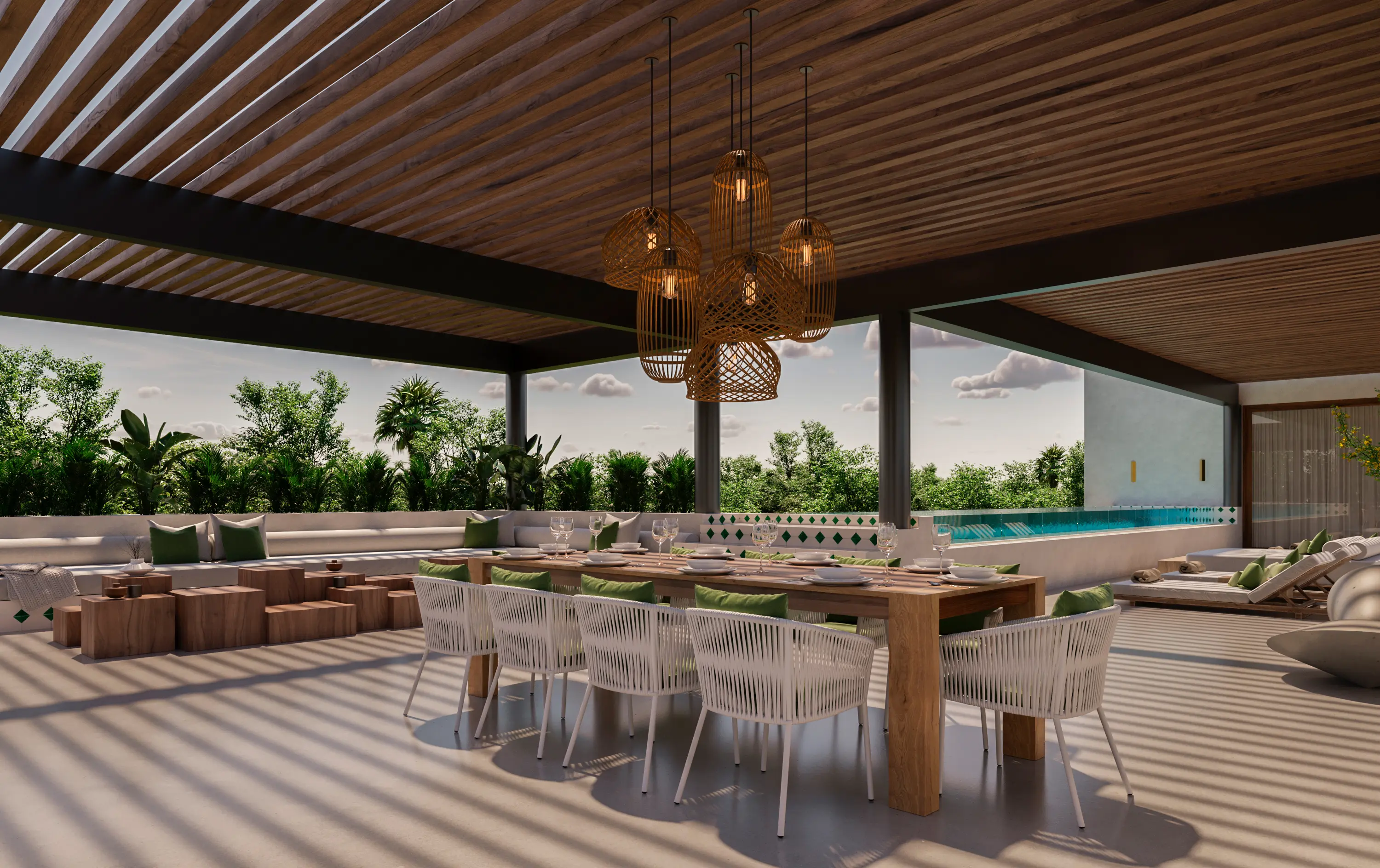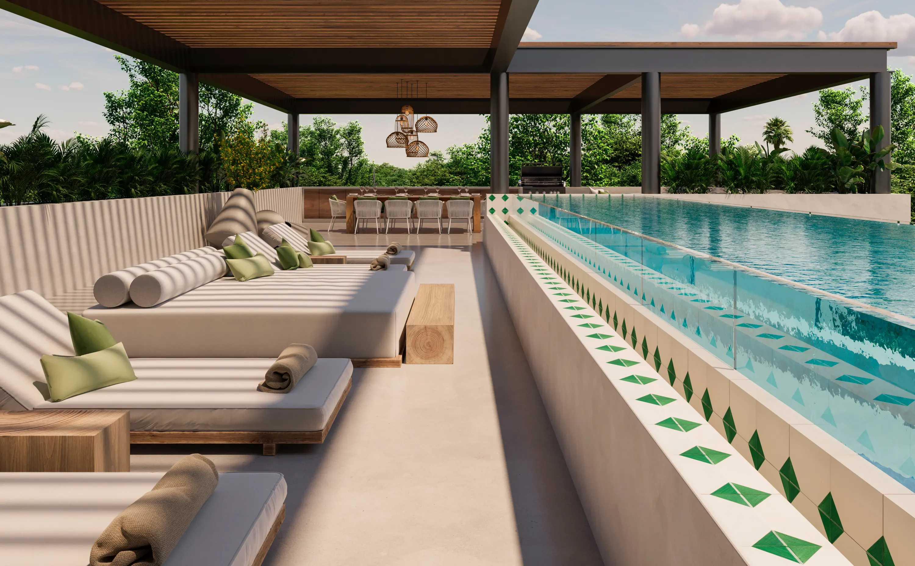 The single-level configuration allows simultaneous use without conflict, while pool and rooftop zones provide distinct gathering spaces that can function independently.