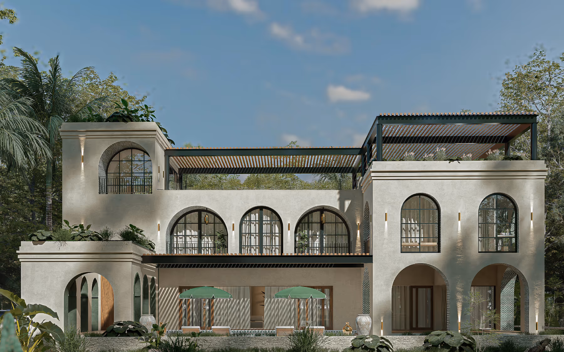 The architecture emphasizes thickness, shade, and enclosure rather than glass expanses. Walls hold temperature, arches guide movement and courtyards extend living outward while maintaining privacy and calm. Every element serves climate, longevity, and comfort.
