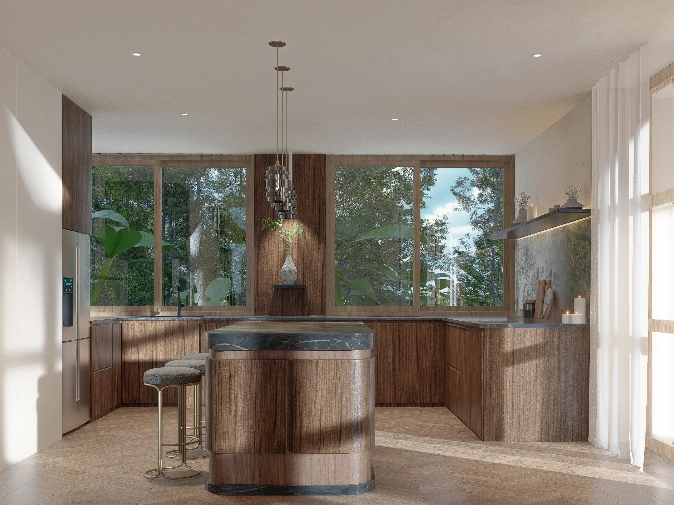 Brass accents appear sparingly, adding warmth without excess. High performance glazing balances transparency with thermal control, maintaining comfort while preserving connection to the landscape.
