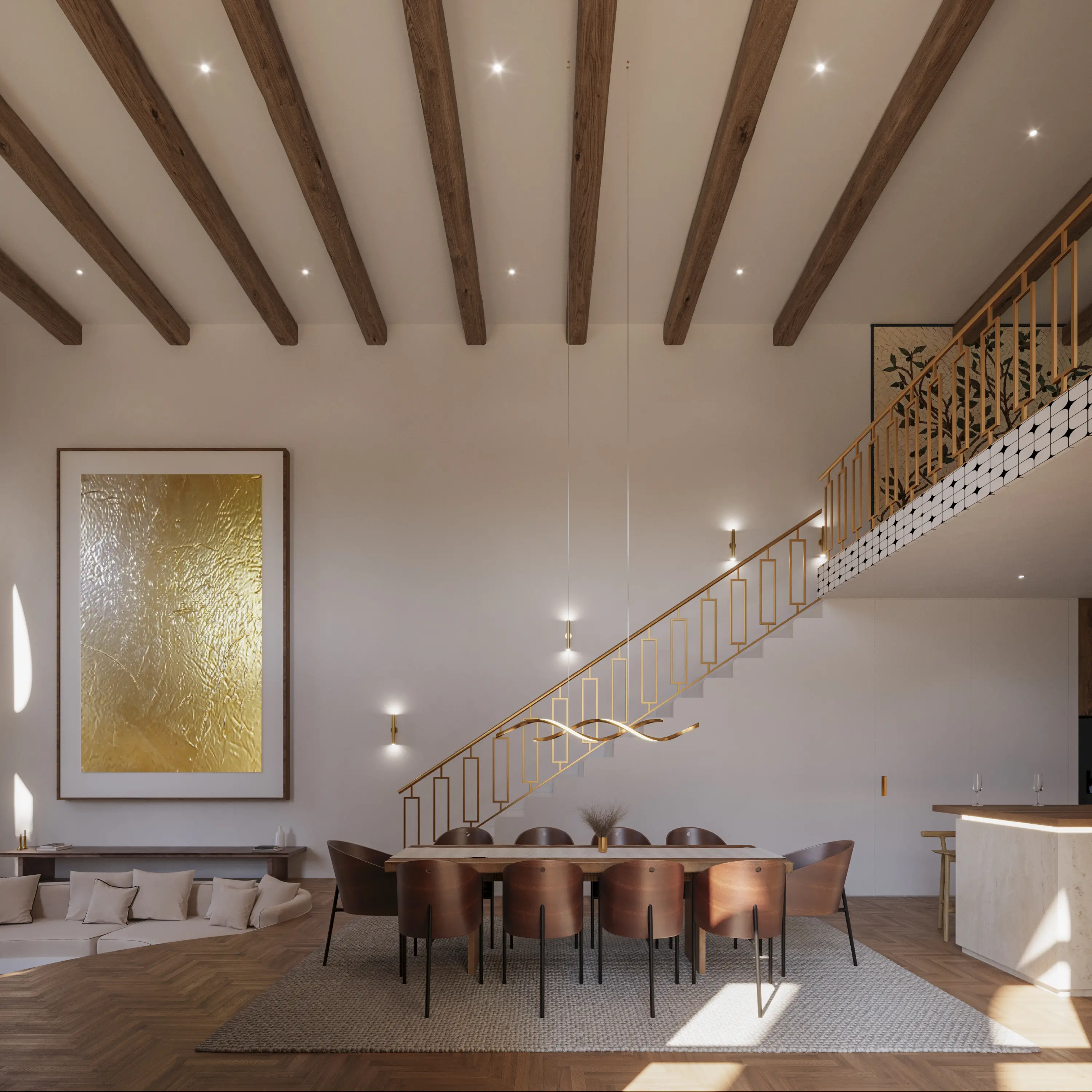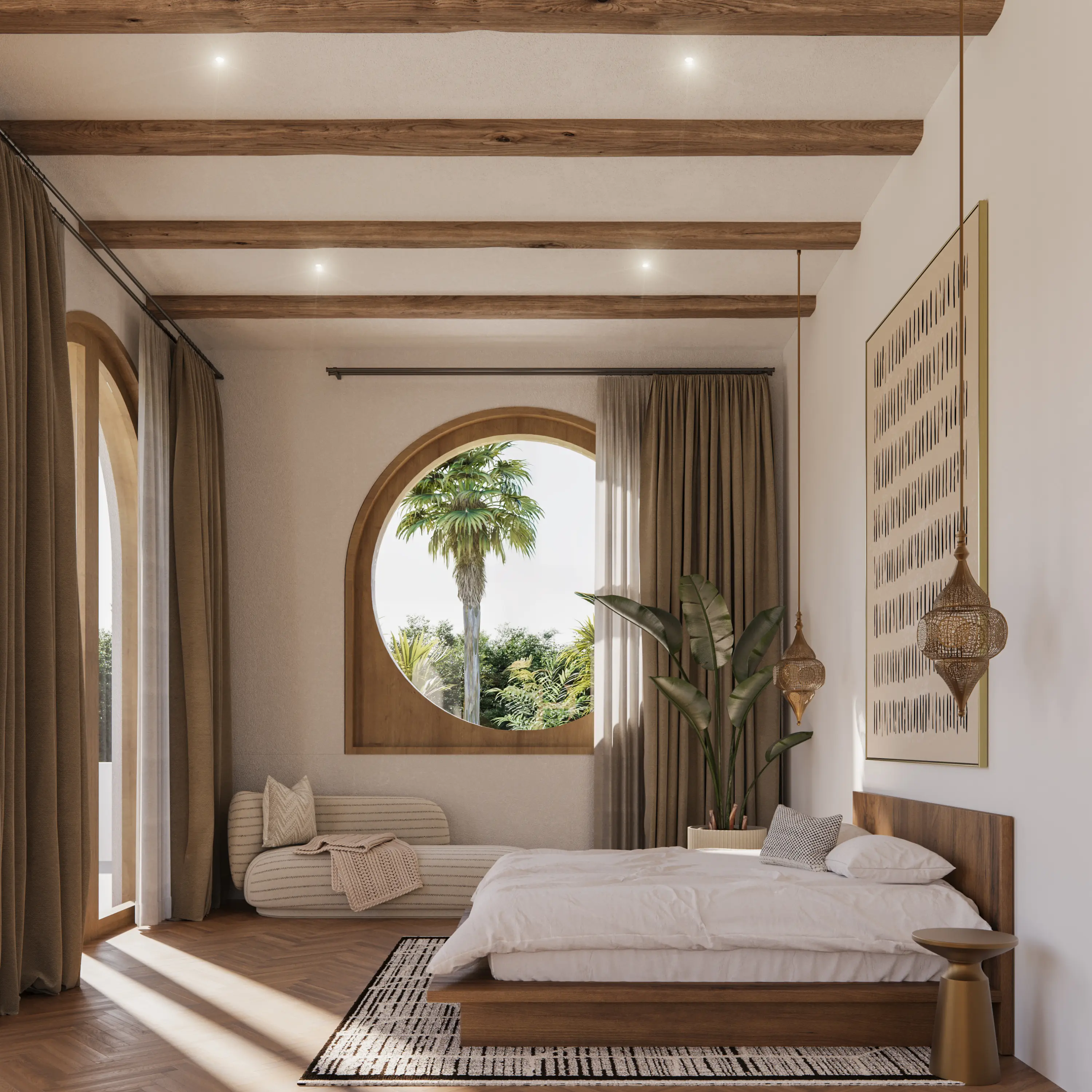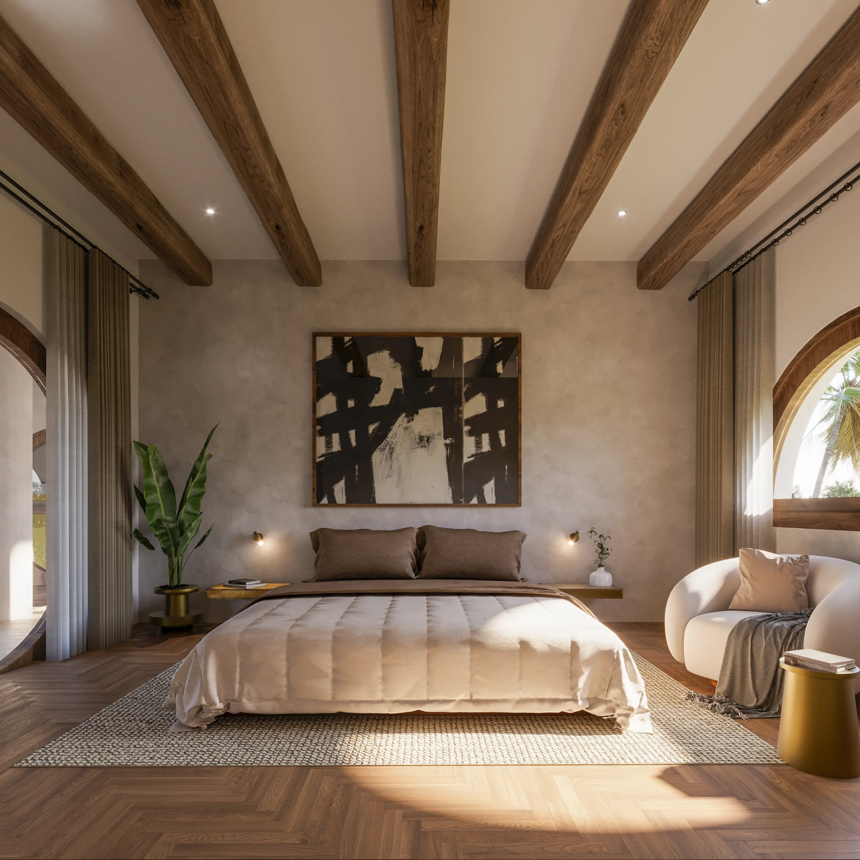 The material palette of Los Arcos is defined by restraint and craftsmanship. Lime textured plaster, natural timber beams, stone surfaces and herringbone wood flooring establish a tactile and timeless environment.