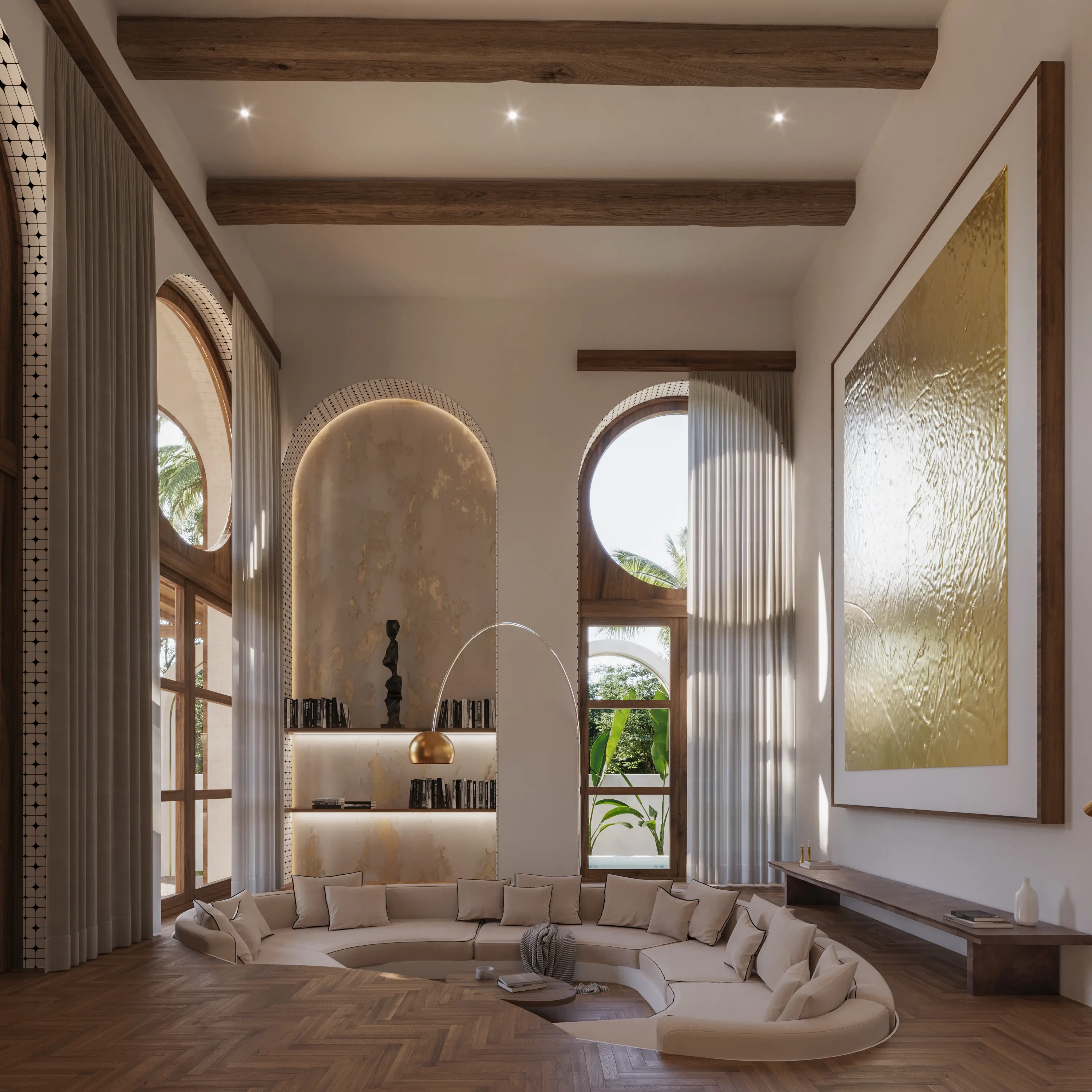 Here, architecture does not compete with nature but frames it. Repeating arches guide movement, shape light and create a measured cadence throughout the home. The result is an environment that feels composed and grounded, where space unfolds with clarity and calm.