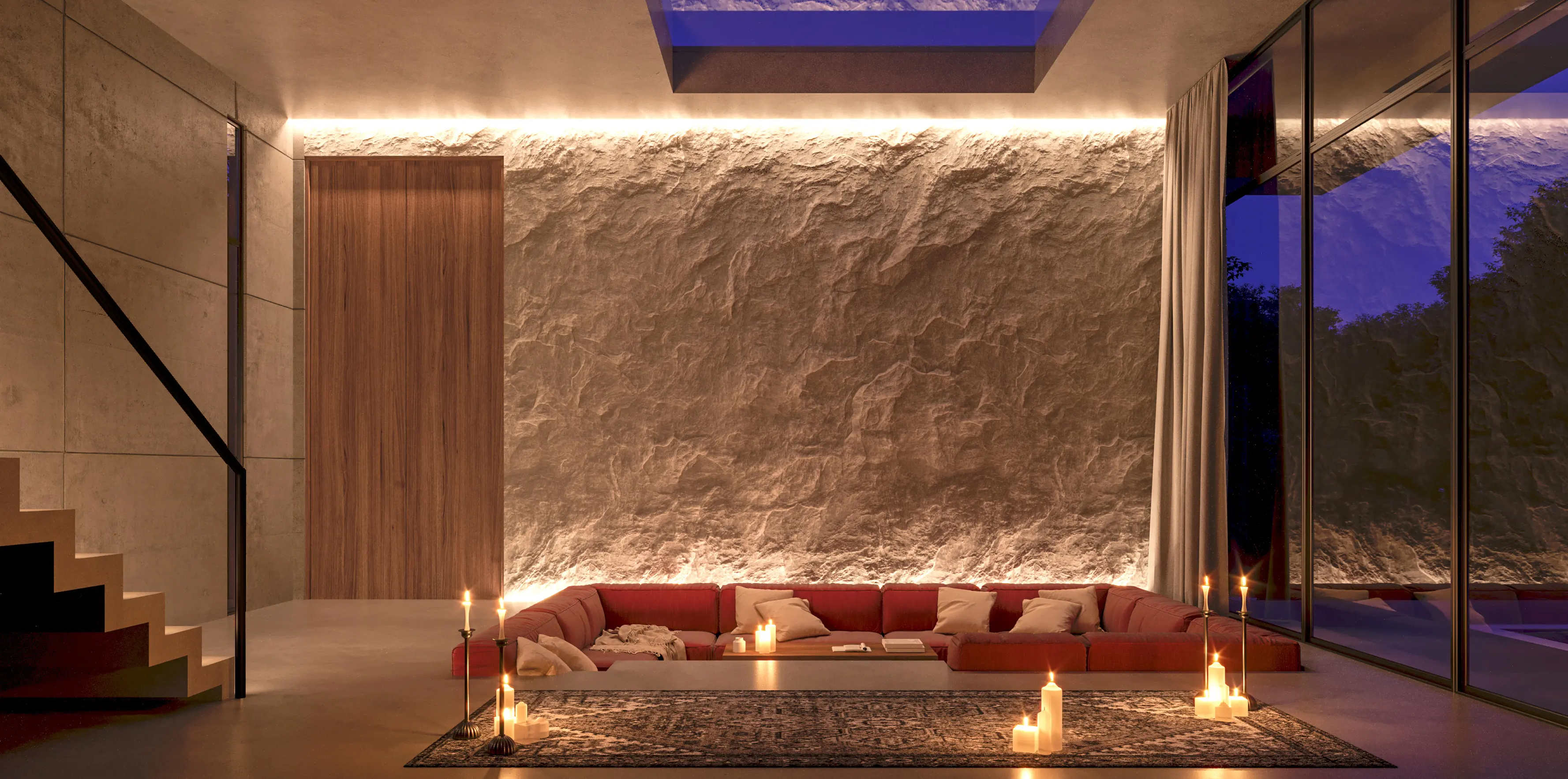 A continuous skylight anchors the home’s central axis, drawing daylight deep into the plan and transforming circulation into experience. Throughout the day, light shifts across concrete, stone, and wood, revealing texture and depth while establishing a constant connection to natural cycles.