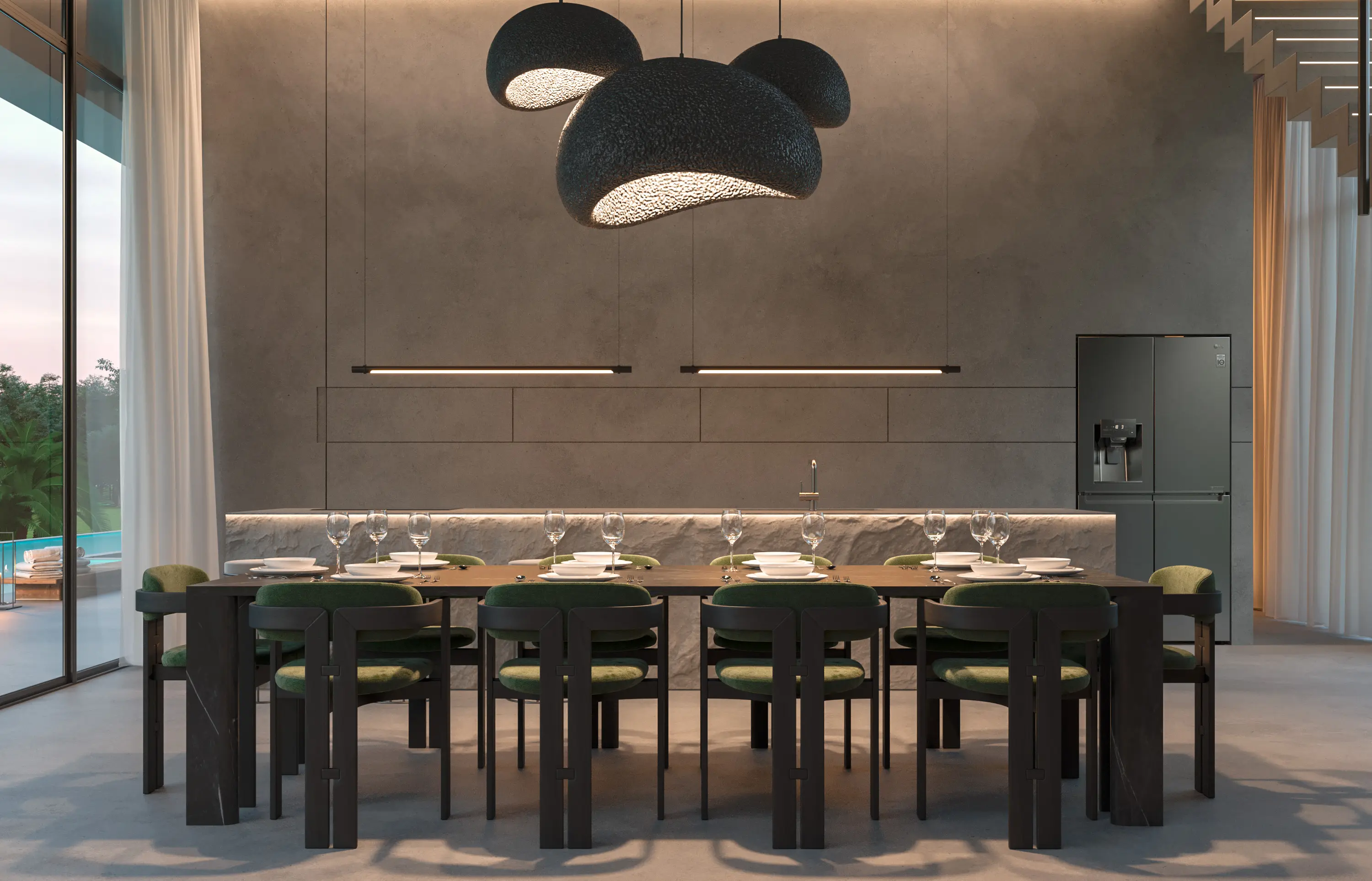 The material identity of Villa Aire is rooted in clarity and permanence. Concrete, stone, wood, and marble are used honestly, allowing texture and proportion to define the aesthetic.
